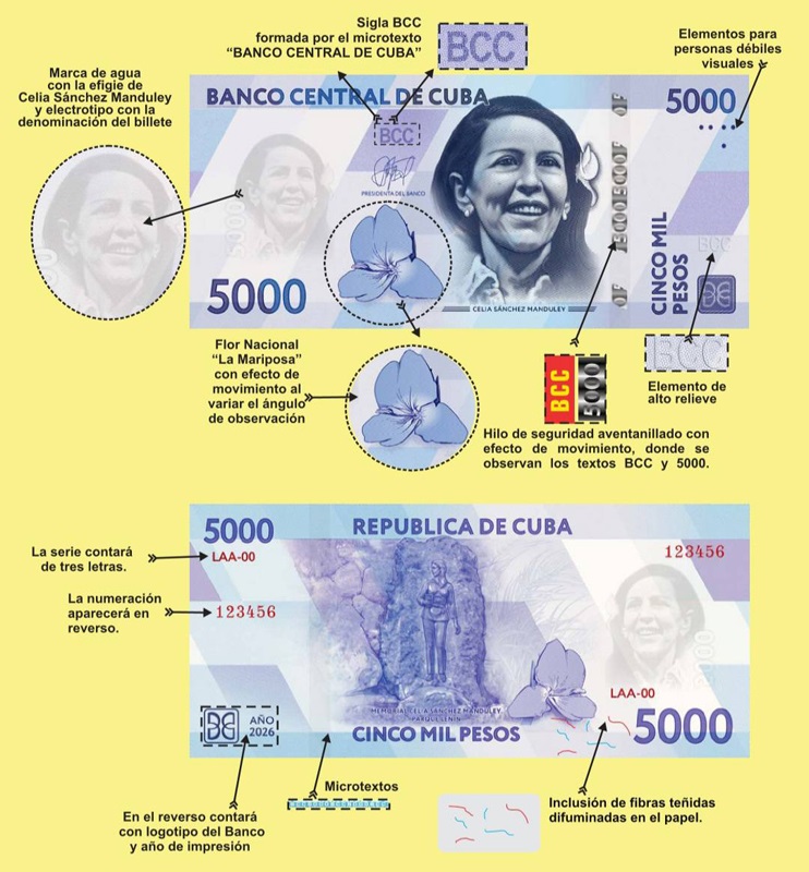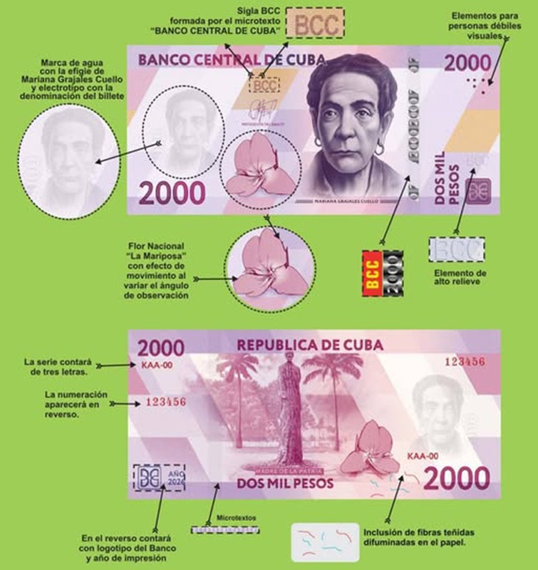 Por primera vez en la historia de la numismática nacional estos dos nuevos billetes incorporarán las imágenes de patriotas cubanas. En el caso del billete de 2 mil CUP, la Madre de la Patria, Mariana Grajales Coello, y en el de 5 mil CUP, la Heroína de la Sierra Maestra, Celia Sánchez Manduley.