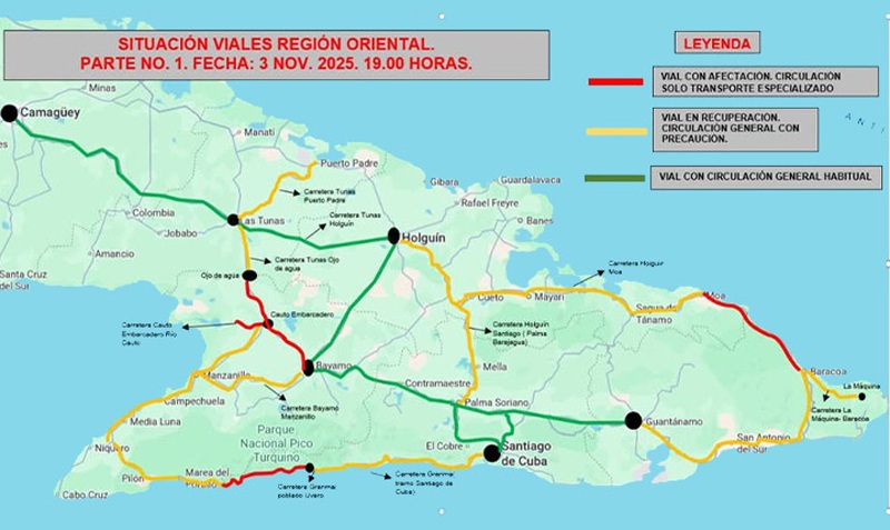 La carretera Moa–Baracoa, esencial para la conexión con el extremo oriental, quedó habilitada solo para transporte especializado. En tanto, las vías Holguín–Moa y Palma–Barajagua permanecieron en recuperación, con tránsito permitido bajo precaución.