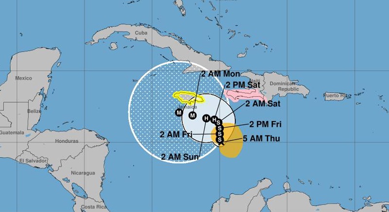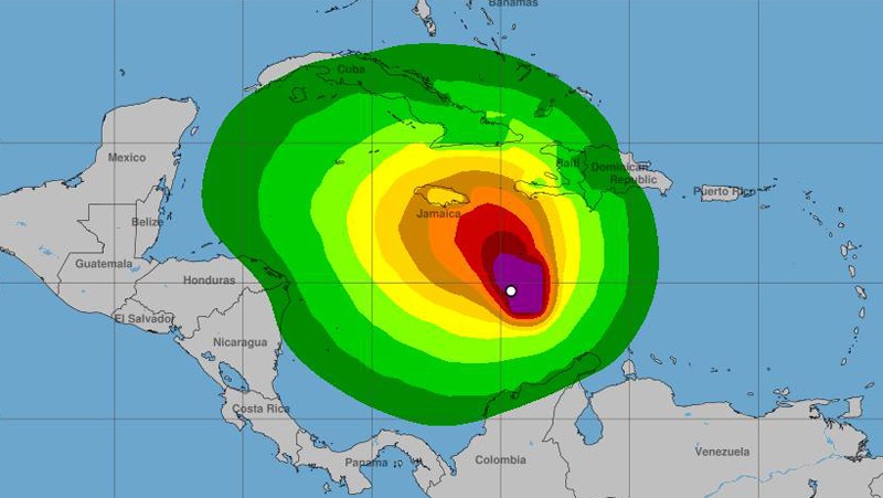 A las seis de la mañana, el centro del organismo ciclónico se localizó en los 15 grados de latitud Norte y 75 grados de longitud Oeste, a unos 370 kilómetros al sudeste de Kingston, Jamaica, con vientos máximos sostenidos de 85 kilómetros por hora y rachas superiores.