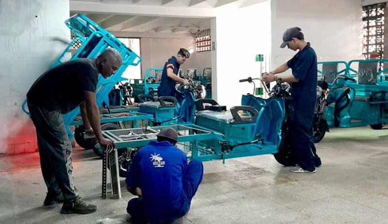 Los trabajadores de la Empresa Mecánica Héroes del 26 de Julio (Holmeca) de Holguín ensamblan un nuevo modelo de triciclos eléctricos como parte de sus proyectos mediante encadenamientos productivos.